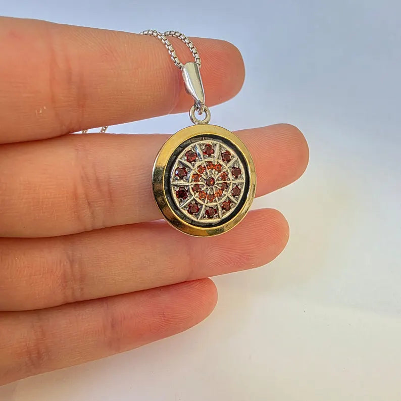 You are going to fall in love with this NEW charming pendant set from Hadar Designers Collection with solid 9k yellow gold and sparkling red Garnet zircons. This Labeled and stamped 925 beauty will be sent to you with a modern recycled brown gift box. (All stains, if are any, are due to camera).
